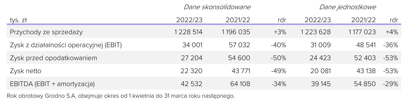 W zakończonym w marcu roku obrotowym 2022/23 Grodno odnotowało rekordowe 1,23 mld zł skonsolidowanych przychodów, przy spadku pozycji wynikowych pod wpływem trudnej sytuacji rynkowej. Okres ten Spółka ocenia jednak jako udany. „Grodno wzmocniło swoją pozycję rynkową, zwiększyło skalę działalności i sfinalizowało kluczowe inwestycje. Jesteśmy dobrze przygotowani na przyszłe wzrosty” – wyjaśnia Prezes Andrzej Jurczak.
