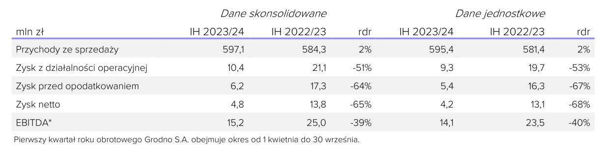 Raport za pierwsze półrocze roku obrotowego 2023/24 potwierdził wcześniejsze szacunki. Skonsolidowane przychody Grodno S.A za okres od kwietnia do września br. wyniosły rekordowe 597,1 mln zł (+2% rdr) i przełożyły się na 4,8 mln zł zysku netto (-65% rdr).