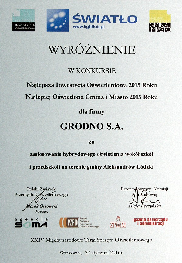 Grodno laureatem konkursu „Najlepsza inwestycja oświetleniowa 2015”. Spółka otrzymała wyróżnienie za hybrydowe oświetlenie terenów wokół szkół i przedszkoli na terenie gminy Aleksandrów Łódzki. Konkurs już po raz 17. zorganizował Polski Związek Przemysłu Oświetleniowego.