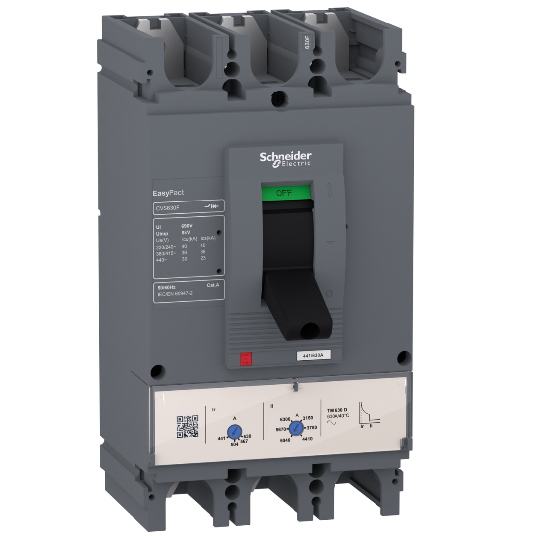 Kompaktowe wyłączniki mocy MCCB o prądzie znamionowym od 16 do 630 A i zdolności wyłączania od 25 do 50 kA. Rozwiązania EasyPact CVS doskonale sprawdzą się w budynkach, przemyśle oraz przy infrastrukturze zasilającej. Wyposażone w mechanizm podwójnego rozłączania, zapewniający wysoką zdolność ograniczania prądu zwarciowego. Umożliwiają łatwą rozbudowę o akcesoria i wyposażenie dodatkowe stosowane w innych produktach Schneider Electric MCCB, szczególnie możliwe jest rozszerzenie o zabezpieczenie przed skutkami zwarć doziemnych dzięki modułowi Vigi.